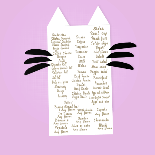 This is the menu for the new Robo Cat Cafe. If you want to order anything, put it down in the comments below! I will tell you how much it is