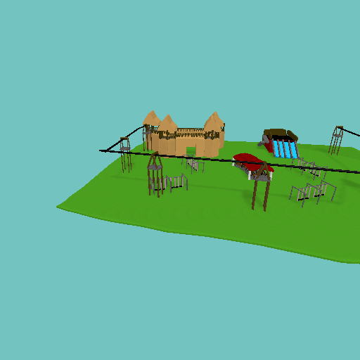 zip line, play castel, swings, water slide.