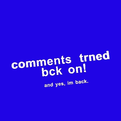 Hey yall im back, so i know i had my comments turned off 4 like a week or sum but im turing da comments bck on cuz ppl requested me 2 turn them bck on. and if yall start trippin again in my comments the comments will be coming off again, so dont play wit me poo, yall sayin "i turned my comments off 4 follower" dats a lie lol.
