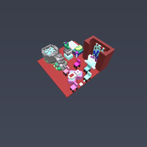 its got a waterfall a bed a table side with a vase on top a rock pool and its got stairs it's got a love heart table with 5 chairs