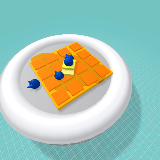 A waffle with 2 chunky pieces and 4 blueberries with a sizzle of honey on a plate with a unique design pattern