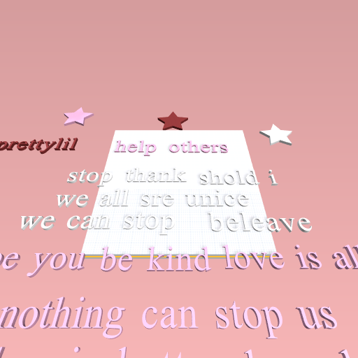 prettylilThanks we need to get other people to like this so they can stop bullying that is my plan we all need to make things that make people think that we need to stop bullying and be better people and I know that all of us need to do that the both of you we need to make a plan and we can get into the challenge which I already did make something good so everyone would call me on it too so I understand that they are mean or they are nice. But we need to make a friendship poster so everyone can be each other's friends and stop bullying and that can be another one of our plans well that's one and we also need to buy other people's stuff you comment on their stuff so we can understand that they made bad stuff but it actually looks good cuz everyone makes fun have other people that I know just like prettylilthang someone making fun of her and saying she's a bully and she's the mean one but the other person was there being the mean one but we all can do this cuz that is what makers Empire is about being kind and not bullying each other and having fun and building and making designs