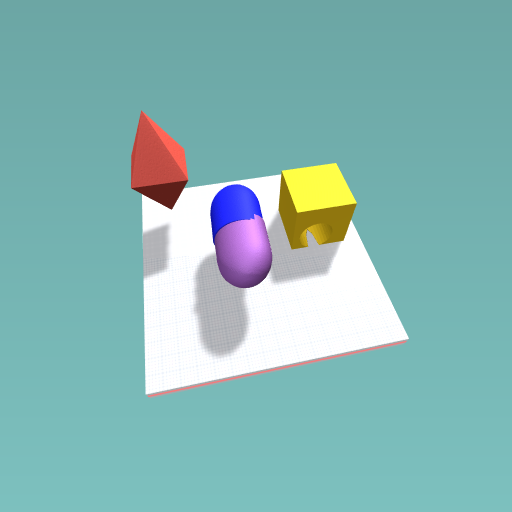 Tere are colorful geomertric shapes, including yellow square , two identical triaangular pyramids, and two identical cylinders.