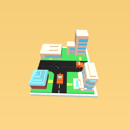 Some building like:houses,hotel,hospital and others with two car driving on the street