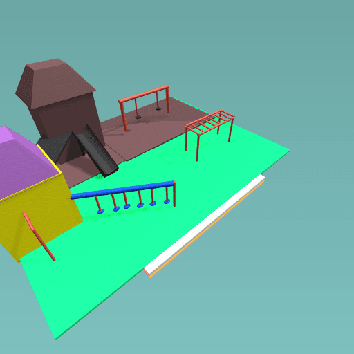There is a monkeybar at the front and a swing behind two houses and a pole to go down and a maze thing.