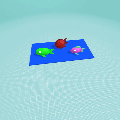 There are 3 fish in the sea 1 of them are green,1 of them are red and 1 of them are pink.