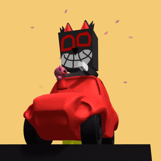 Cartoon cat playing with piggy in car