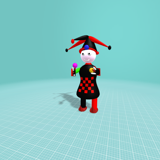 A Jester juggling different colored balls wearing a red and black jester outfit, with pointy shoes and hat.