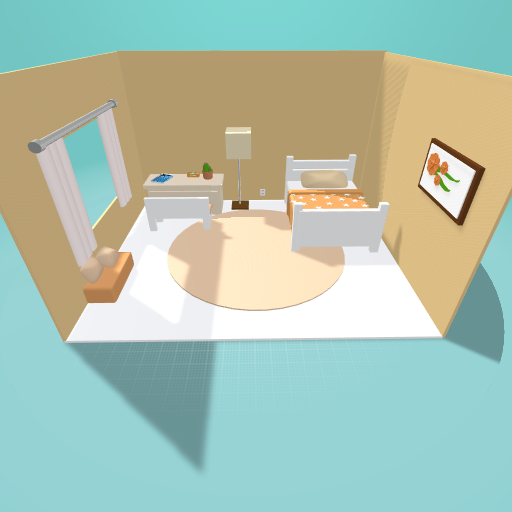 The orange, yellow, and light white furniture give this room a warm glow, bringing a feeling of optimism into the air. GIVE ME CREDIT IF YOU BUY IT!