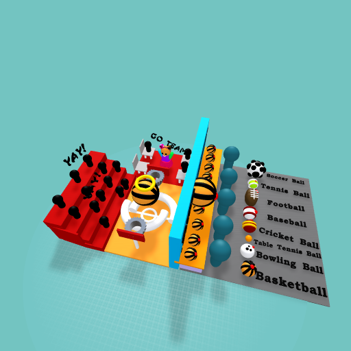 On one side is a basketball court with a mascot cheering. The other side is people making sports equipment that can change by a press of the RED button.