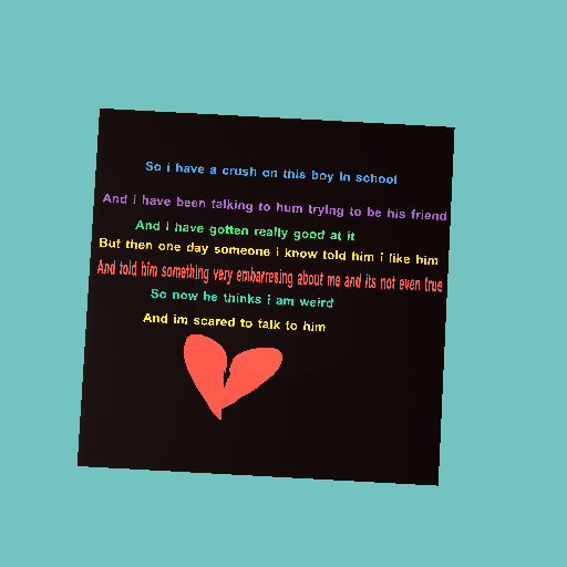 Everyone in the school now knows beacuse she told EVERYONE and everyone is coming uo to me and saying ew! Why do u like him Ali! Is it true you like him??ughhhhh someone is writing on the bathroom stall that they like him to and everyone thinks it ME