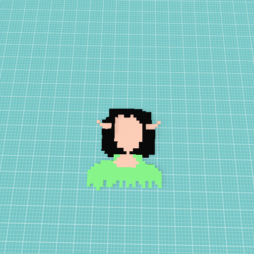 A black harired elf with a light green start of a shirt.