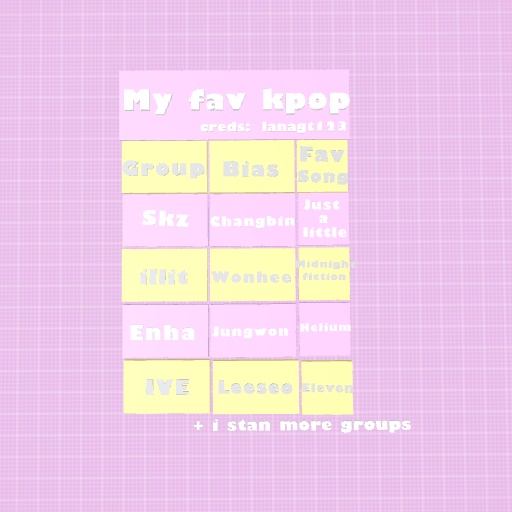 Creds to lanagt123 for the idea! I also stan alot more groups than only these (lsrfm, odd youth, twice, njz, etc) but i cant fit them all in