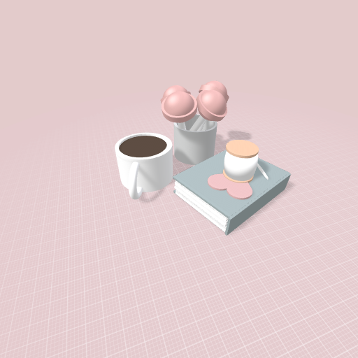 This is a person who is sewing, reading and drinking a cup of coffee with lollies.