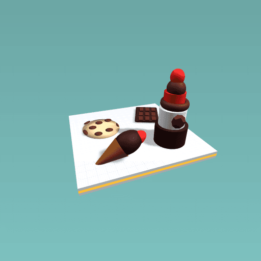 It has a choco chip cookie, a bar of chocolate, an ice cream cone and the big cake!