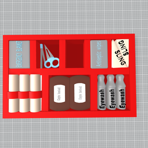 This design is of a first-aid kit. It has eyewash, bandaids, wipes, twizers, scisss, emergency blanlet, slings,badaid rolls