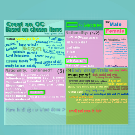 Female| |Race1: Latin/Latina| |Race2: Custom| |personality:positive(in short) | |Custom animal parts/accs