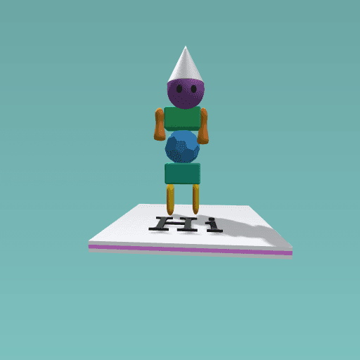 This is a weird,funny-looking,crazy birthday boy with angel-white party hat; amythest purple head; pentagonal body; and sun yellow legs.