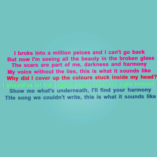 this is the chorus from What It Sounds Like from Kpop Demon Hunters. Pink is Rumi, red is Zoey, green is Mira and blue is all at once.